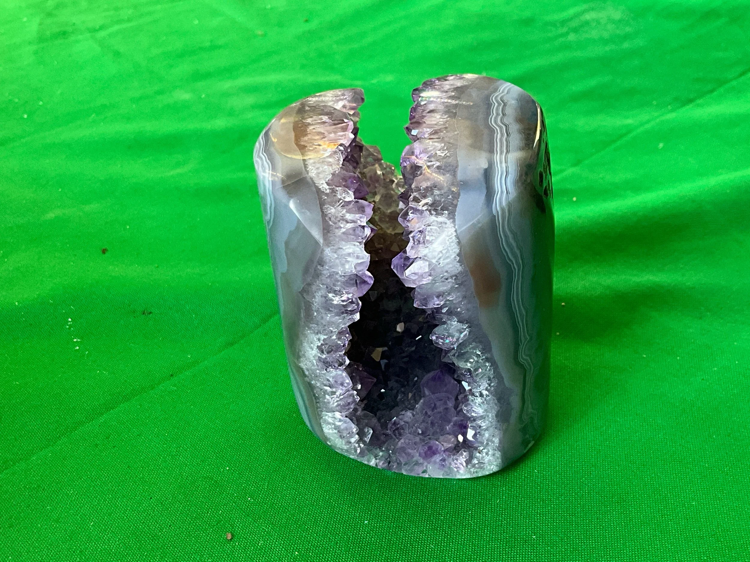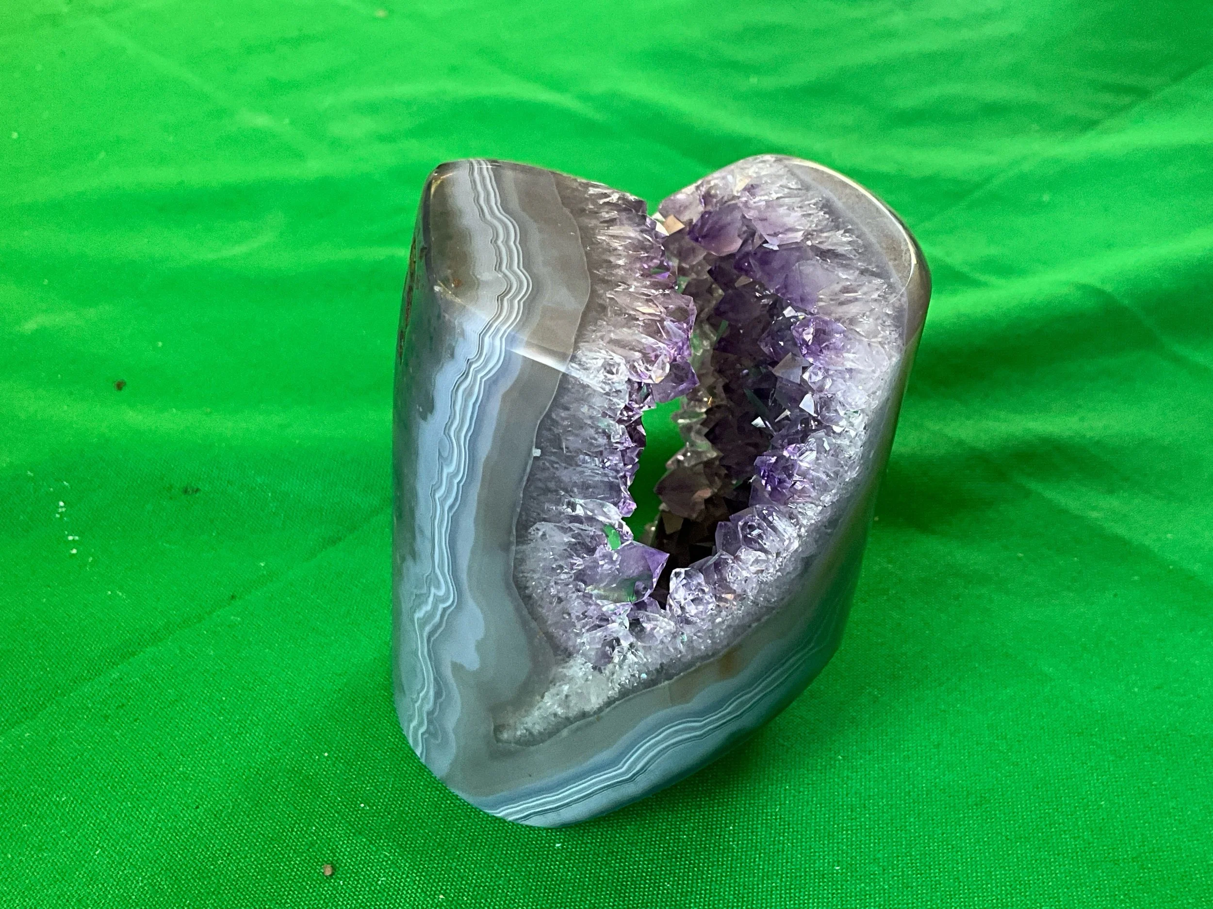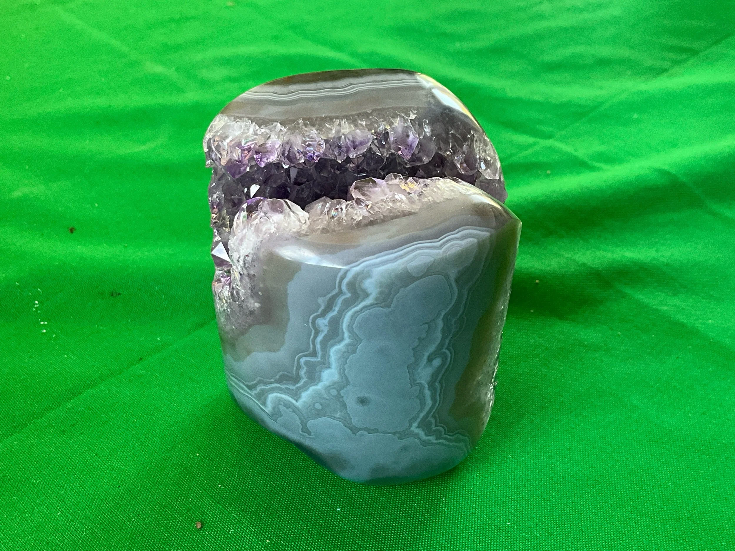 An amethyst geode that had its entire matrix polished. Visible amethyst stretches in a line from the bottom ‘front’ to two-thirds of the way down the ‘back’.